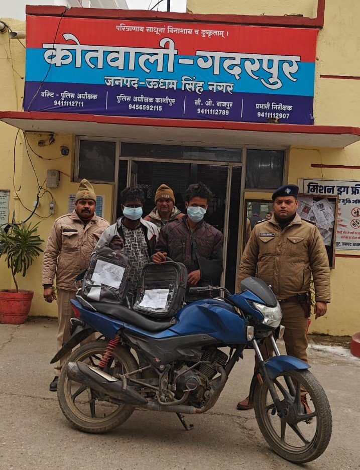 रुद्रपुर। जनपद में अपराध नियंत्रण को लेकर पुलिस की कार्रवाई लगातार जारी है। इसी कार्रवाई के तहत गदरपुर पुलिस को बड़ी सफलता मिली है। पुलिस ने चोरी की घटना का खुलासा करते हुए 2 शातिर चोरों को गिरफ्तार किया। पुलिस ने दोनों के कब्जे से चोरी गए 4 अदद लैपटॉप एवं एक चोरी की बाईक बरामद की है। पुलिस के मुताबिक 4 जनवरी 26 को पीड़ित अंकुर चावला पुत्र स्व तिलकराज चावला, निवासी ग्राम बराखेड़ा, कोतवाली गदरपुर में तहरीर दी। तहरीर में कहा कि दिनेशपुर-मटकोटा रोड पर स्थित ओवरसीज नामक कार्यालय से अज्ञात चोरों ने लैपटॉप आदि सामान चोरी कर लिया। पुलिस ने तहरीर के आधार पर मामला पंजीकृत कर जांच एसआई मुकेश मिश्रा के सुपुर्द की गई। खुलासा के लिए पुलिस टीम ने कार्रवाई शुरू की। ग्राम सूरजपुर होते हुए चीनी मिल, दिनेशपुर अंडरपास से खेत के किनारे दो अभियुक्तों को गिरफ्तार किया। अभियुक्तों के कब्जे से चोरी के 4 लैपटॉप एवं बिना नंबर प्लेट की बाईक बरामद की। पुलिस ने दोनों के खिलाफ कार्रवाई करते हुए कोर्ट में पेश किया। पुलिस के मुताबिक गिरफ्तार अभियुक्त पूर्व में भी चोरी के अभियोगों में जेल जा चुके हैं, जिनका आपराधिक इतिहास खंगाला जा रहा है।